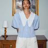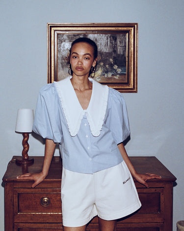 Designed in Switzerland, the Deborah puff-sleeve shirt blends classic inspiration with thoughtful modern detailing. It is crafted in Poland by master artisans, where precision and care shape every element. The shirt features handmade pearl buttons, crafted from natural mother of pearl, offering a refined highlight that recalls vintage jewellery. Cut from exceptional sky blue striped cotton sourced from Spain and woven from doubled extra-fine fibers, the fabric is naturally resistant to wrinkles and easy to iron. A romantic frilled collar and the sculpted volume of the sleeves create a distinct silhouette with a sense of charm and individuality. Light, breathable, and polished, it is a piece that moves easily between relaxed styling and more defined looks.