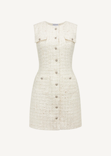 Designed in Switzerland and crafted in Poland by expert artisans, the Taylor sleeveless mini dress brings together precision tailoring and exceptional materials. The fabric is a remarkable off white tweed made in South Tyrol, Italy, by a manufacturer with 130 years of heritage. Woven with virgin wool and a touch of cashmere for softness, it is subtly accented with delicate threads that catch the light. Inside, it is fully lined with breathable, silky Italian cupro from Lombardy, ensuring comfort without compromising structure. At the front, handmade crystal buttons from Lombardy add a jewellery like finish, each one carefully set to highlight the dress’s sculpted silhouette. Elegant and distinctive, it carries a composed presence that stands confidently in refined, formal settings.