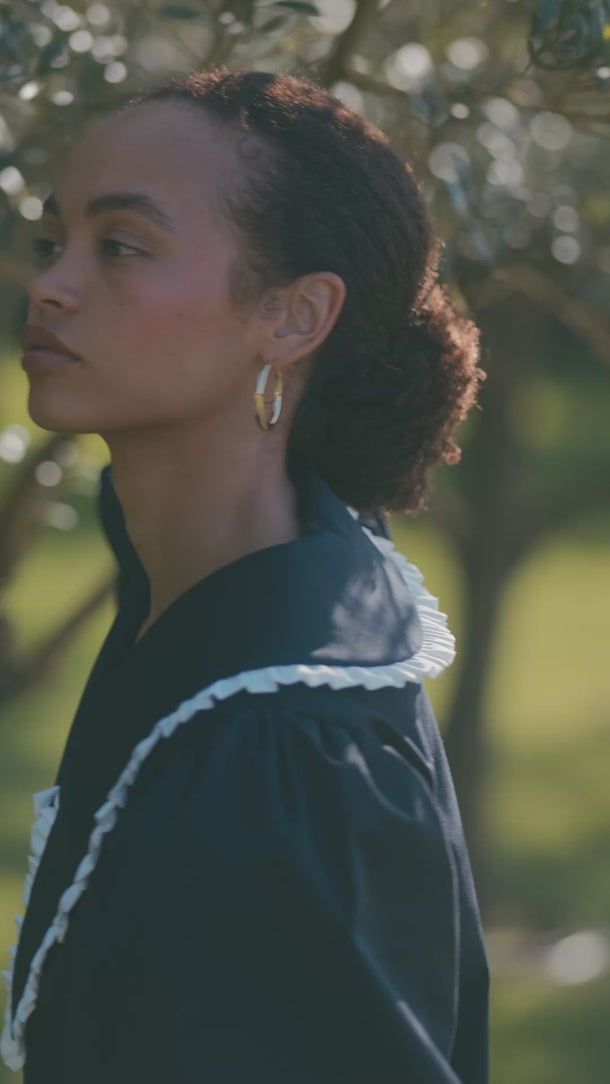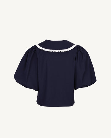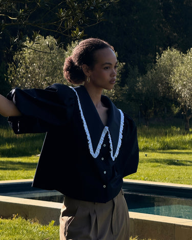 Designed in Switzerland, the Deborah puff-sleeve shirt blends classic inspiration with thoughtful modern detailing. It is crafted in Poland by master artisans, where precision and care shape every element. The shirt features handmade pearl buttons, crafted from natural mother of pearl, offering a refined highlight that recalls vintage jewellery. Cut from exceptional navy blue cotton sourced from Spain and woven from doubled extra-fine fibers, the fabric is naturally resistant to wrinkles and easy to iron. A romantic frilled collar and the sculpted volume of the sleeves create a distinct silhouette with a sense of charm and individuality. Light, breathable, and polished, it is a piece that moves easily between relaxed styling and more defined looks.