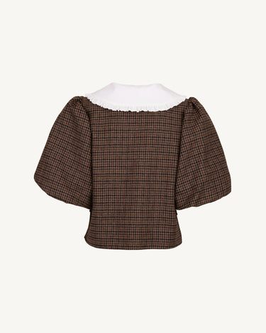 Designed in Switzerland and crafted in Poland by skilled artisans, the Joel blouse is tailored from a soft blend of cashmere and virgin wool woven in Portugal. The fabric features a refined check pattern, offering texture and visual depth while remaining breathable and gentle on the skin. A crisp white collar adds contrast and structure, while puff sleeves bring volume and a sense of romantic movement. Inside, it is fully lined with dense and silky Italian cupro from Turin for added comfort. The front is finished with handmade metal buttons from Italy, chosen for their subtle shine and enduring character. Elegant yet fresh, the Joel blouse balances tradition and modernity with quiet confidence.